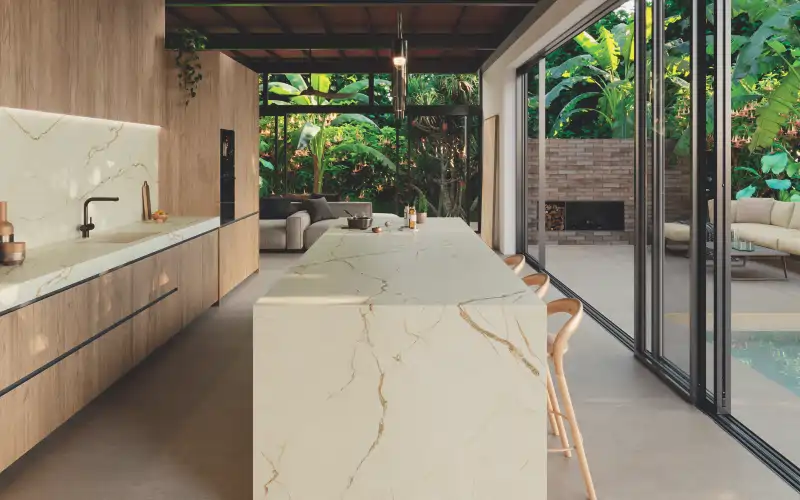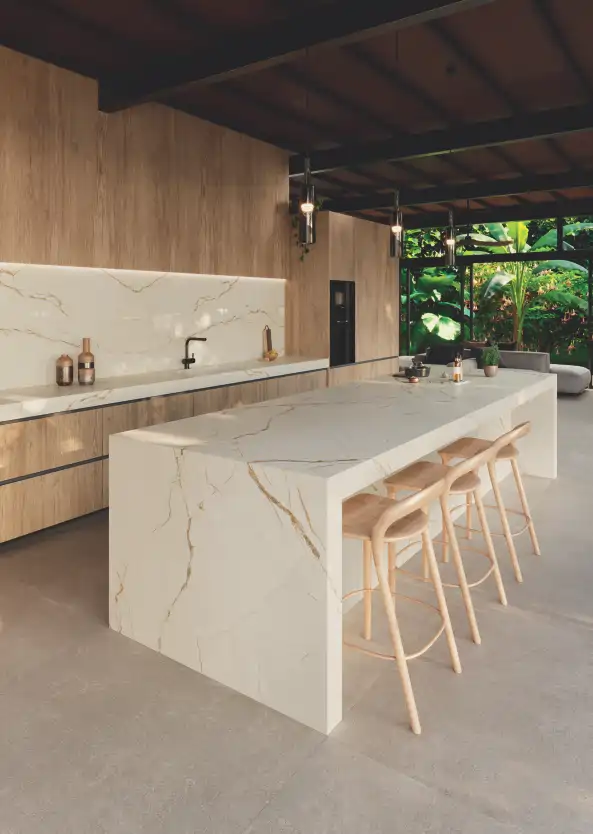 Coverlam Canela Roma merges the natural charm of warm marble tones with advanced slab technology engineered for long-lasting performance. Its lightweight composition and dimensional stability allow for versatile installation across vertical and horizontal surfaces.